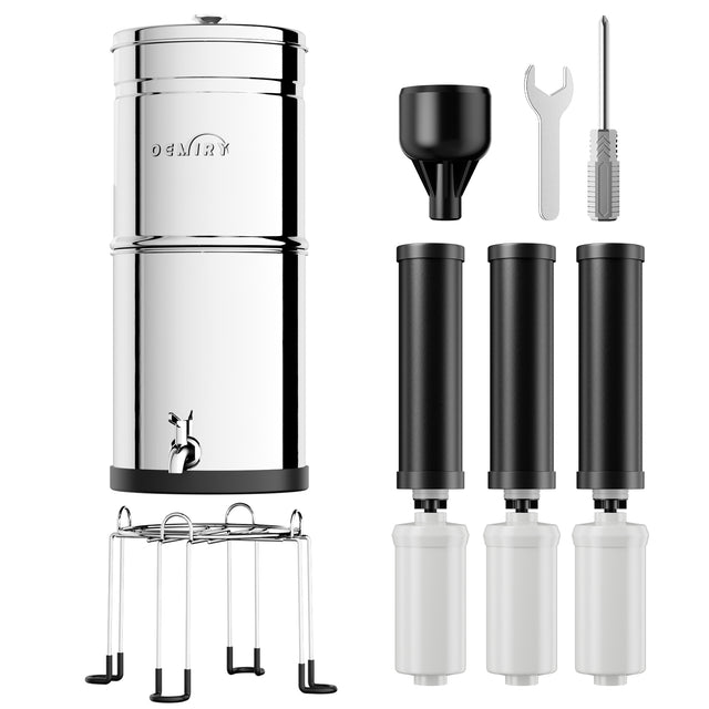 3.25G Gravity-Fed Water Filter System, 304 Stainless Steel System with 3 Carbon Filters, 3 Fluoride Filters and Stand