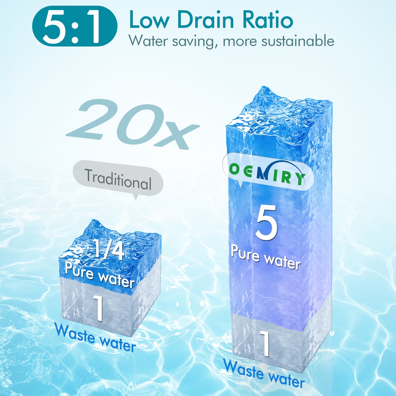 - [5:1 DRAIN RATIO] Reverse osmosis countertop systems have a 5:1 ratio of filtered water to wasted water, which is the high drainage level on the market. Compared to other models with a 1:4 drainage ratio, the RO countertop systems is an economical choice. More importantly, you can say goodbye to worrying about the quality of tap water and using plastic bottles.